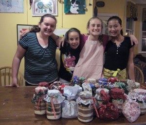 Only after they were putting in the top layers of the cookies did they realize that the recipe called for 1 1/2 quart jars instead of 1 quart jars! The moms didn’t catch that detail either. What to do with the extra stuff? put it in a baggie? add it to the recipe so the purchaser of the jar would need to add more dry ingredients? They decided to make little cloth bags that would go with each jar containing a baggie of the extra oats. Whew! problem solved.