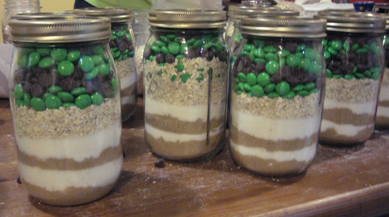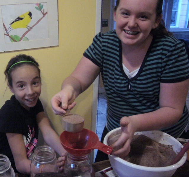 Only after they were putting in the top layers of the cookies did they realize that the recipe called for 1 1/2 quart jars instead of 1 quart jars! The moms didn’t catch that detail either. What to do with the extra stuff? put it in a baggie? add it to the recipe so the purchaser of the jar would need to add more dry ingredients? They decided to make little cloth bags that would go with each jar containing a baggie of the extra oats. Whew! problem solved.