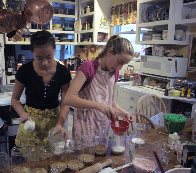 Today my house was occupied by 4 teenaged girl scouts working on a craft project to sell at the Holiday Boutique at the church. They decided to make gift jars of cookies and hot cocoa, ten jars of each. It turned out to be a math challenge for them calculating exactly how much of each ingredient to buy. How many cups in a pound? How many table spoons in a cup? Then they had to trouble shoot how to pack the ingredients so the layers would look nice from the outside, experimenting with the wooden pusher for the chinois, a spatula, and a saran covered candlestick bottom.