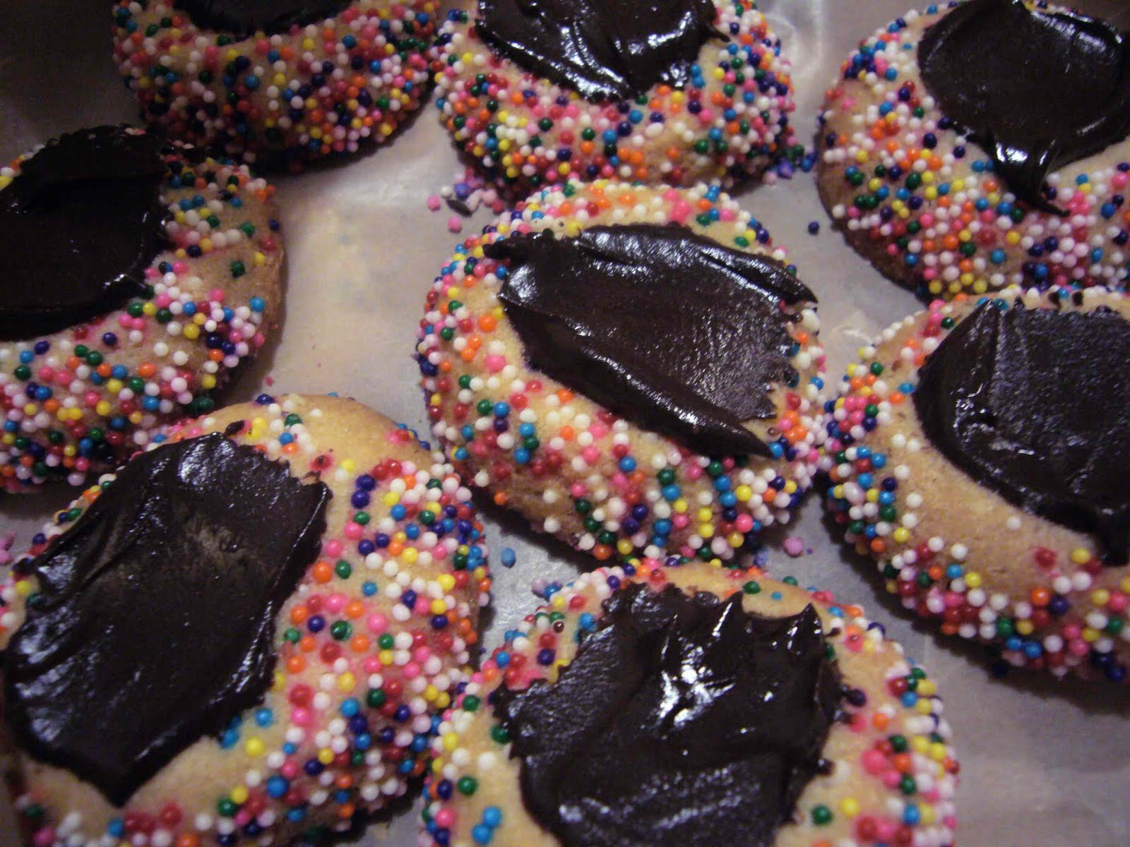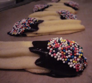 Spritz cookies dipped in chocolate then dipped in sprinkles.