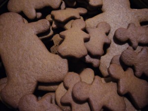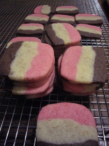 Neapolitans: Three layers of cookie, chocolate, butter cookie with chopped walnuts and almond cookie with pink coloring.Gingerbread People