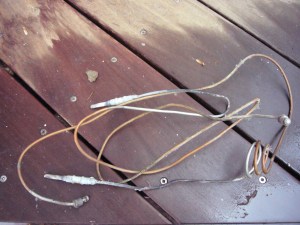 Now if you know us at all, you know we love to cook, bake, can, and entertain, so this stove has gotten a workout over the last 20 years. Many loaves of bread (Brian bakes all our breads) countless quarts of spaghetti sauce, soup, chili, pickles, salsa, ketchup, relish, veggies, fruit and jam have been canned, and many meals have been cooked on this faithful appliance. It has required little maintenance over the years and it is a good thing because the closest (and only) repairman for these stove is in Berkeley. Well, last month Brian took a week long baking class at the San Francisco Baking Institute. It is a French baking school and he spent the week perfecting baguettes. Ever since he has been baking his breads using a pan full of stainless steel bb’s in the bottom of the oven that he sprays with water to create the steam needed for the first 5 minutes of baking. This makes the perfect crust. He used to just open the oven door a crack and spray water in every minute for the first 5 minutes, but the BB’s make more steam. Of course just before I planned to do some cookie baking, one of the ovens stopped working! The steam had blown out the oven pilot and it wouldn’t relight. So we called the guy from Reliance Appliance to come out and he replaced some things like this thermocouple.