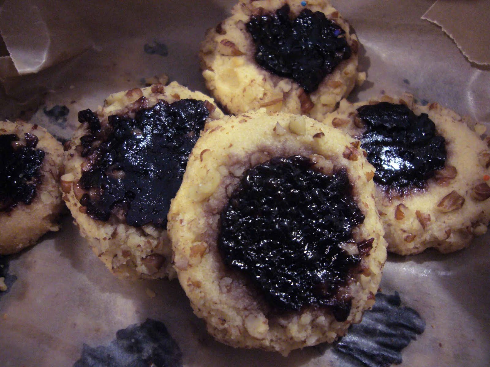 Jelly thumbprints rolled in pecans and filled with homemade blackberry jam