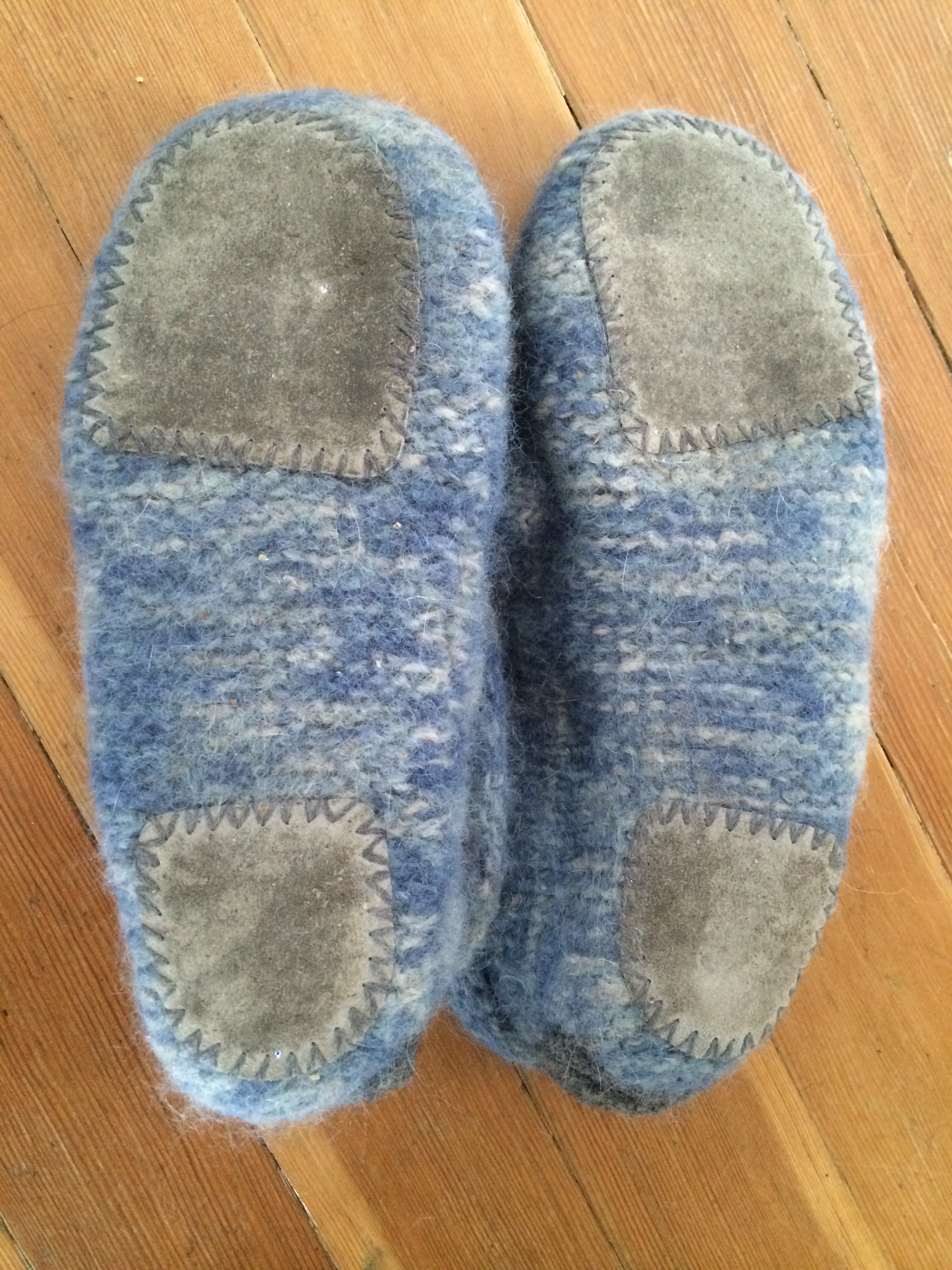 As with all felting projects, the knitting always ends up looking so huge and I never quite believe that is is all going to work out. Here are the slippers next to MY feet, pre felting. Granted my feet are smaller than hubby’s feet, but still, they are huge.