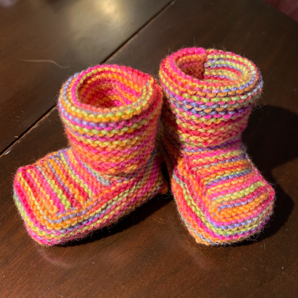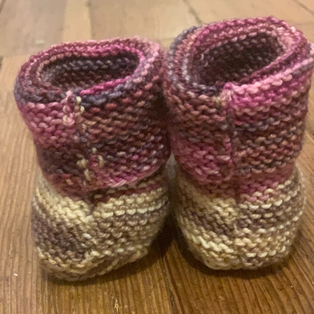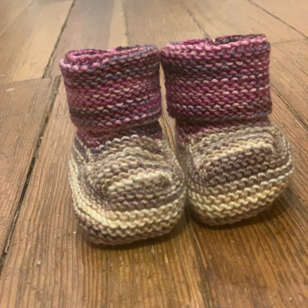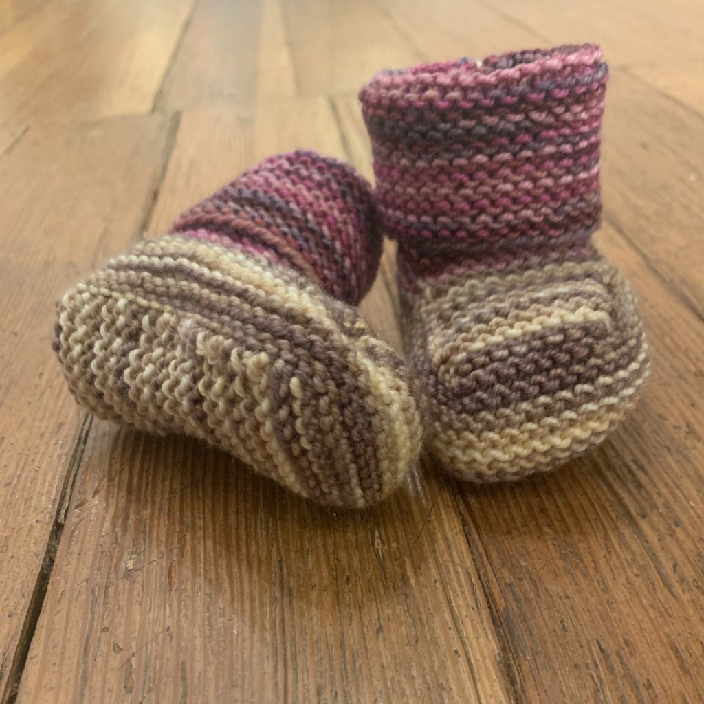 So back to the pattern for these booties. I cast on and played with it ripping them out until I figured out the stitch counts that made a bootie that wasn’t lopsided. I used scraps of sock yarn I had in my basket, and churned out three pair. I have written up the pattern that is downloadable here. Let me know if you make them, send me a photo and any advice to make the pattern more clear and easy to follow.